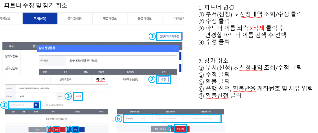 • 반드시 시스템을 통해 직접 파트너를 변경하셔야 하며, 대진표 작성 이전까지 변경을 완료하셔야 합니다.